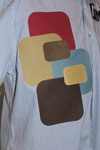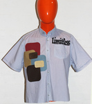 Upcycled Button-Up Short Sleeve Collared Shirt Blue White Stripes, Fabric Patches & Foam Text, Size Large